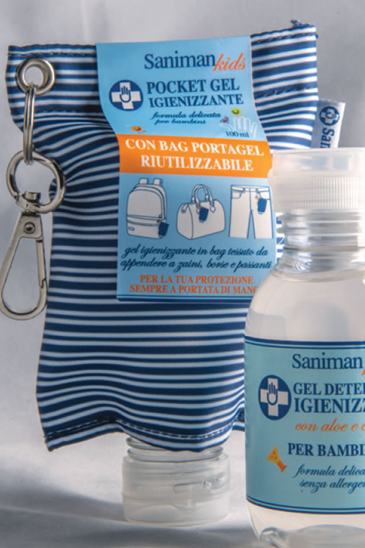 Una sacchetta portagel comoda riutilizzabile da appendere alla tua borsa ed avere il gel Saniman per igienizzare le mani sempre a portata.